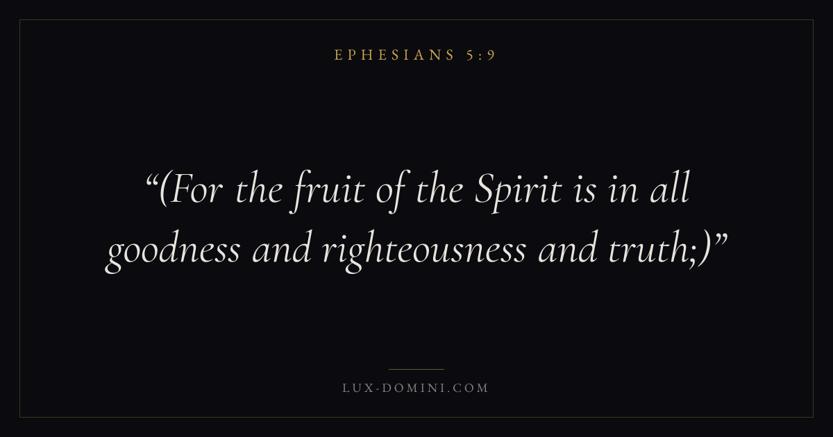 Books / Ephesians / Chapter 5 / Verse 9 ← Ephesians 5:8 Ephesians 5:9 Ephesians 5:10 → (For the fruit of the Spirit is in all goodness and righteousness and truth;) Download verse card Share on Twitter Share on Facebook Pin it ✦ Key themes GraceTruthUnion with ChristChurch Read with Ephesians 5:7Ephesians 5:8Ephesians 2:82 Corinthians 12:9 Related topics Bible verses about graceBible verses about truth ✦ Ephesians Chapter 5 verses V. 1 V. 2 V. 3 V. 4 V. 5 V. 6 V. 7 V. 8 V. 9 V. 10 V. 11 V. 12 V. 13 V. 14 V. 15 V. 16 V. 17 V. 18 V. 19 V. 20 V. 21 V. 22 V. 23 V. 24 V. 25 V. 26 V. 27 V. 28 V. 29 V. 30 V. 31 V. 32 V. 33