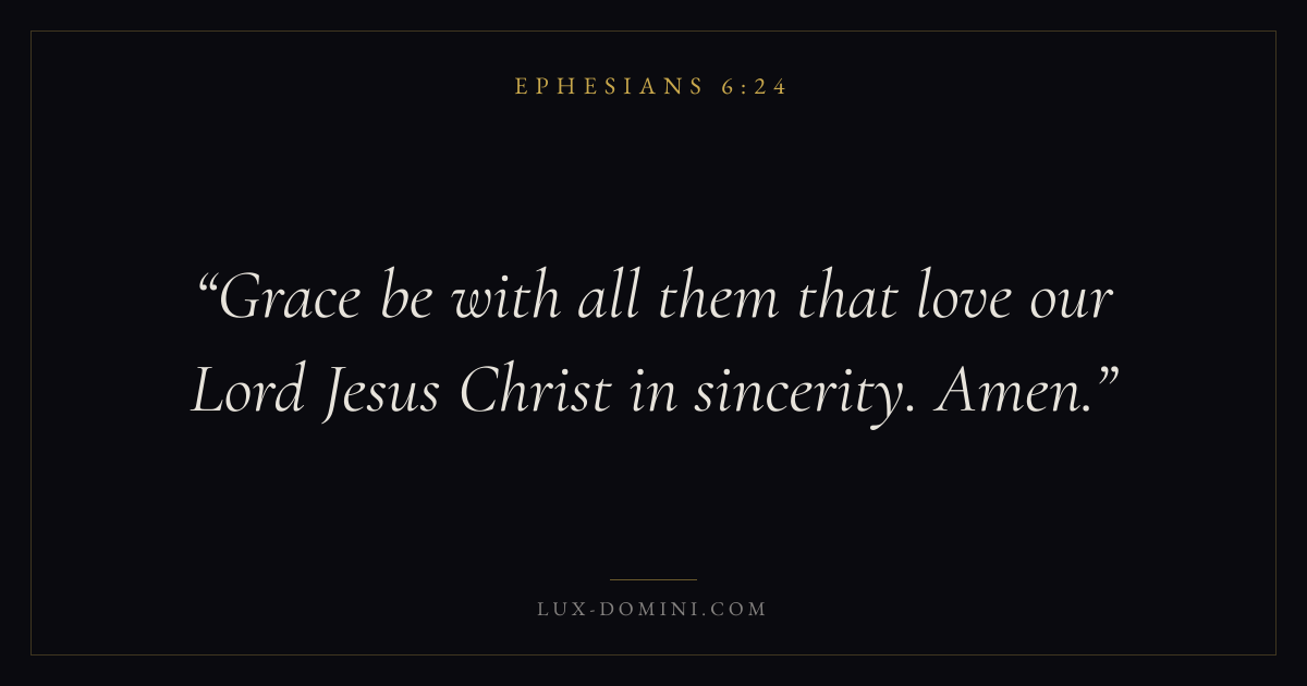 Books / Ephesians / Chapter 6 / Verse 24 ← Ephesians 6:23 Ephesians 6:24 Philippians 1:1 → Grace be with all them that love our Lord Jesus Christ in sincerity. Amen. Download verse card Share on Twitter Share on Facebook Pin it ✦ Key themes LoveGraceUnion with ChristChurch Read with Ephesians 6:23John 3:161 Corinthians 13:4Ephesians 2:8 Related topics Bible verses about loveBible verses about grace ✦ Ephesians Chapter 6 verses V. 1 V. 2 V. 3 V. 4 V. 5 V. 6 V. 7 V. 8 V. 9 V. 10 V. 11 V. 12 V. 13 V. 14 V. 15 V. 16 V. 17 V. 18 V. 19 V. 20 V. 21 V. 22 V. 23 V. 24