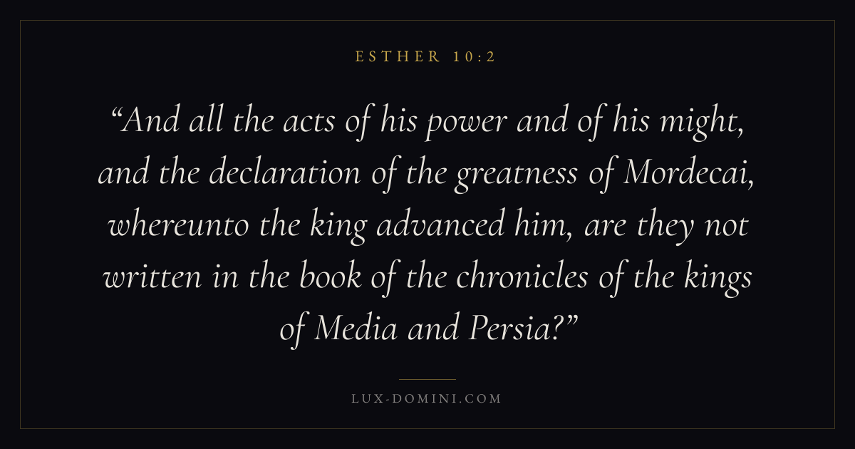 And all the acts of his power and of his might, and the declaration of the greatness of Mordecai, whereunto the king advanced him, are they not written in the book of the chronicles of the kings of Media and Persia?