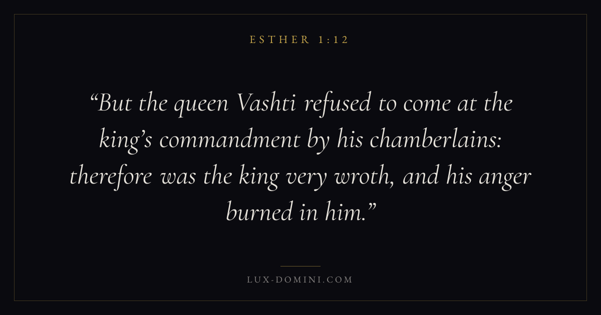 But the queen Vashti refused to come at the king’s commandment by his chamberlains: therefore was the king very wroth, and his anger burned in him.