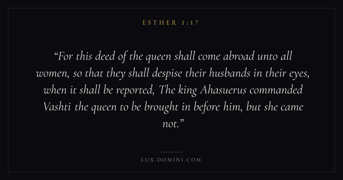 For this deed of the queen shall come abroad unto all women, so that they shall despise their husbands in their eyes, when it shall be reported, The king Ahasuerus commanded Vashti the queen to be brought in before him, but she came not.
