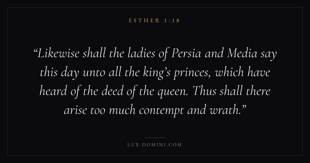 Likewise shall the ladies of Persia and Media say this day unto all the king’s princes, which have heard of the deed of the queen. Thus shall there arise too much contempt and wrath.