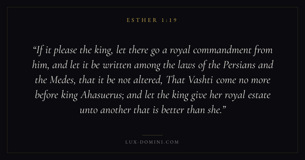 If it please the king, let there go a royal commandment from him, and let it be written among the laws of the Persians and the Medes, that it be not altered, That Vashti come no more before king Ahasuerus; and let the king give her royal estate unto another that is better than she.