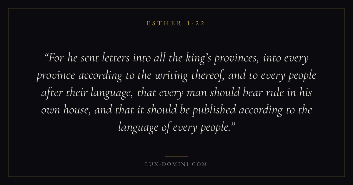 For he sent letters into all the king’s provinces, into every province according to the writing thereof, and to every people after their language, that every man should bear rule in his own house, and that it should be published according to the language of every people.