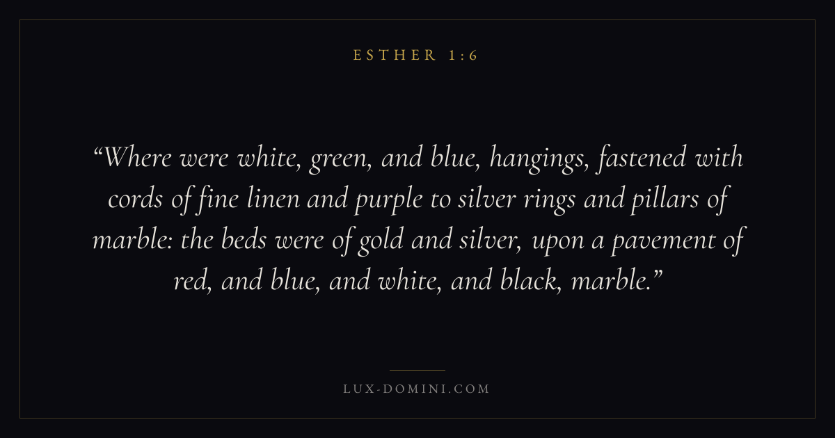 Where were white, green, and blue, hangings, fastened with cords of fine linen and purple to silver rings and pillars of marble: the beds were of gold and silver, upon a pavement of red, and blue, and white, and black, marble.