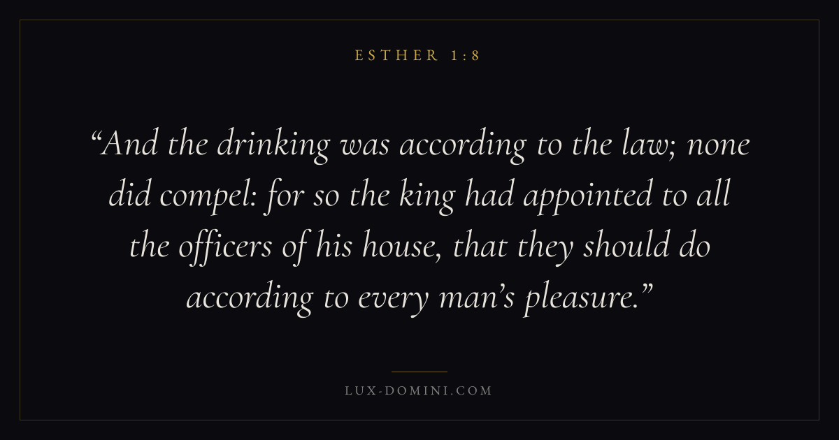 And the drinking was according to the law; none did compel: for so the king had appointed to all the officers of his house, that they should do according to every man’s pleasure.
