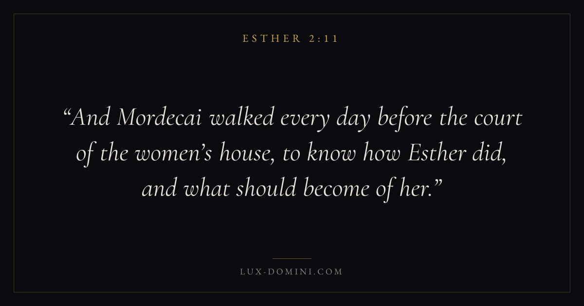 And Mordecai walked every day before the court of the women’s house, to know how Esther did, and what should become of her.