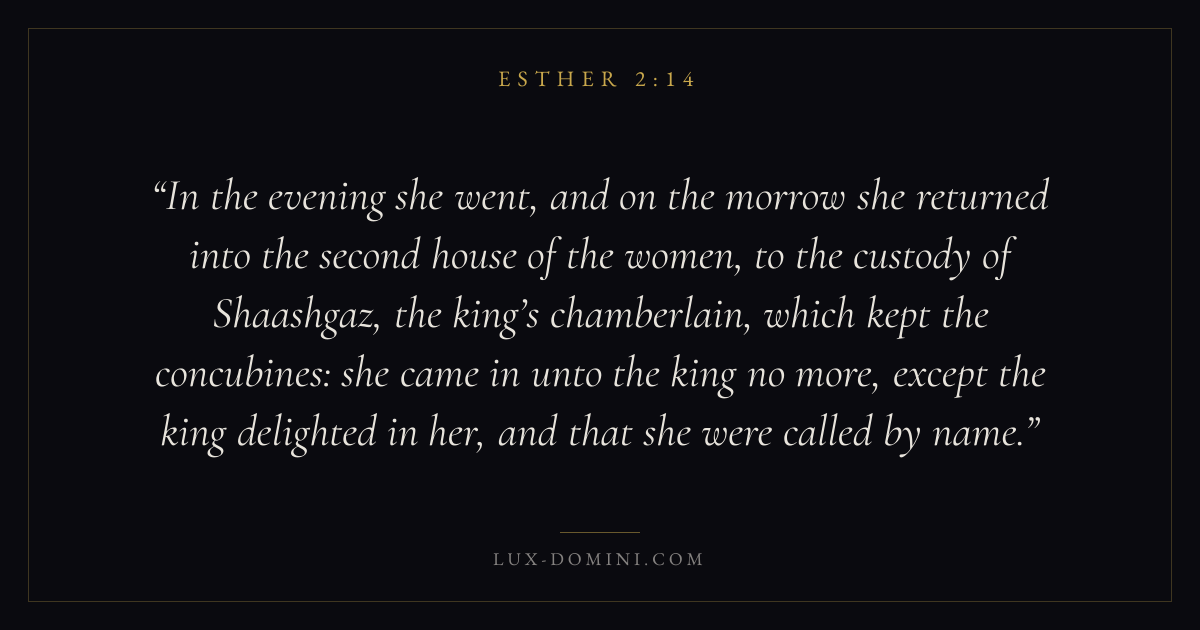 In the evening she went, and on the morrow she returned into the second house of the women, to the custody of Shaashgaz, the king’s chamberlain, which kept the concubines: she came in unto the king no more, except the king delighted in her, and that she were called by name.
