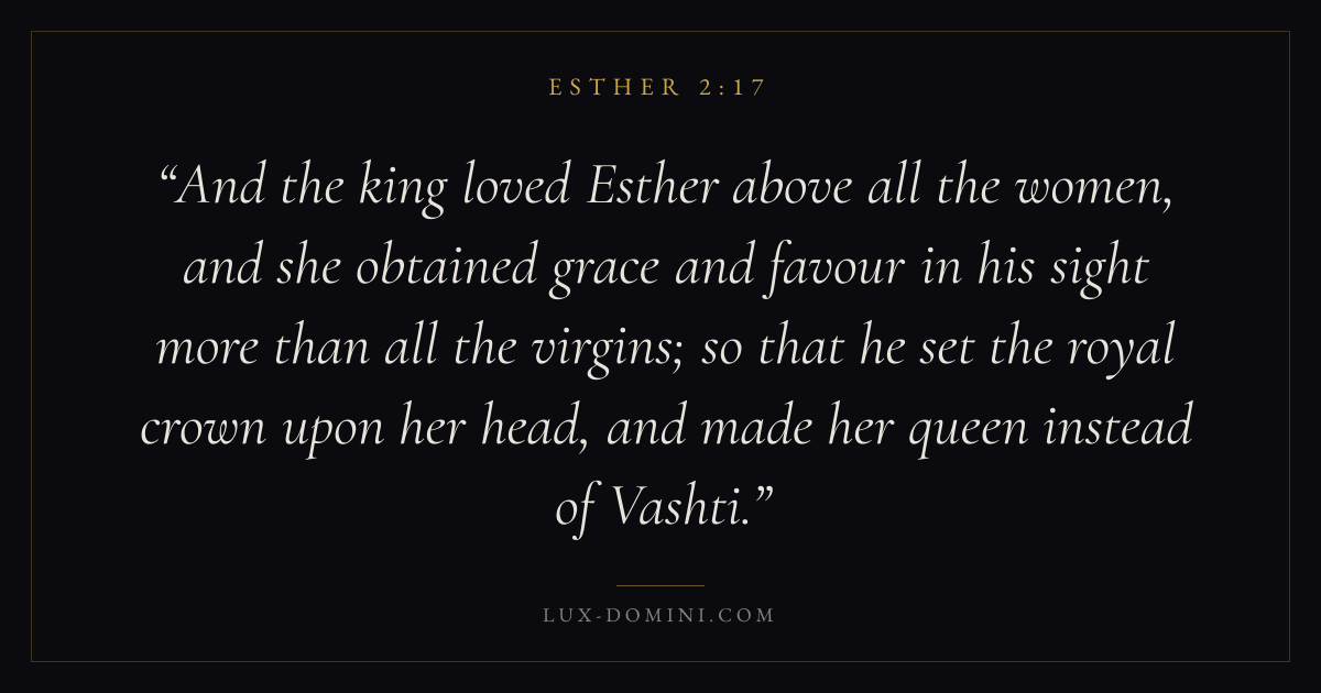 And the king loved Esther above all the women, and she obtained grace and favour in his sight more than all the virgins; so that he set the royal crown upon her head, and made her queen instead of Vashti.
