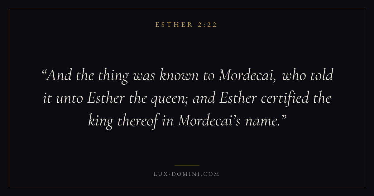 And the thing was known to Mordecai, who told it unto Esther the queen; and Esther certified the king thereof in Mordecai’s name.