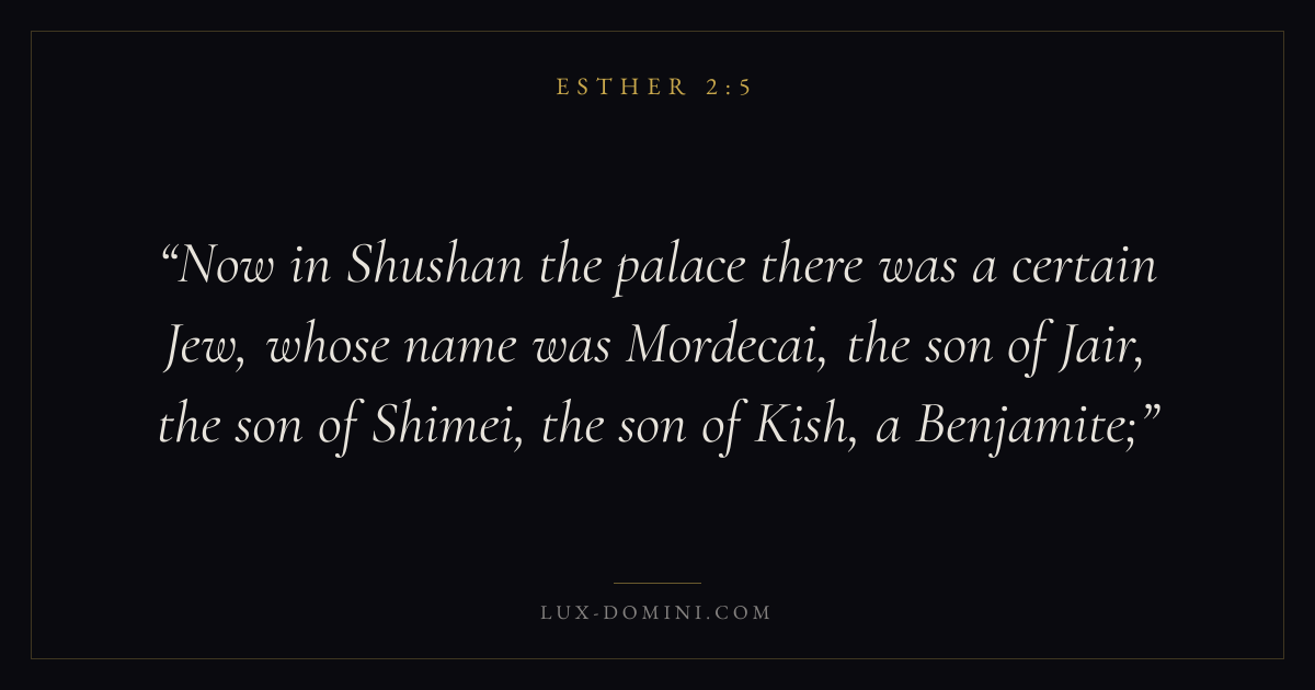 Now in Shushan the palace there was a certain Jew, whose name was Mordecai, the son of Jair, the son of Shimei, the son of Kish, a Benjamite;