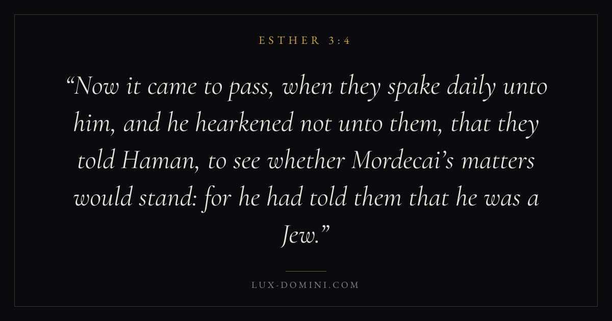 Now it came to pass, when they spake daily unto him, and he hearkened not unto them, that they told Haman, to see whether Mordecai’s matters would stand: for he had told them that he was a Jew.