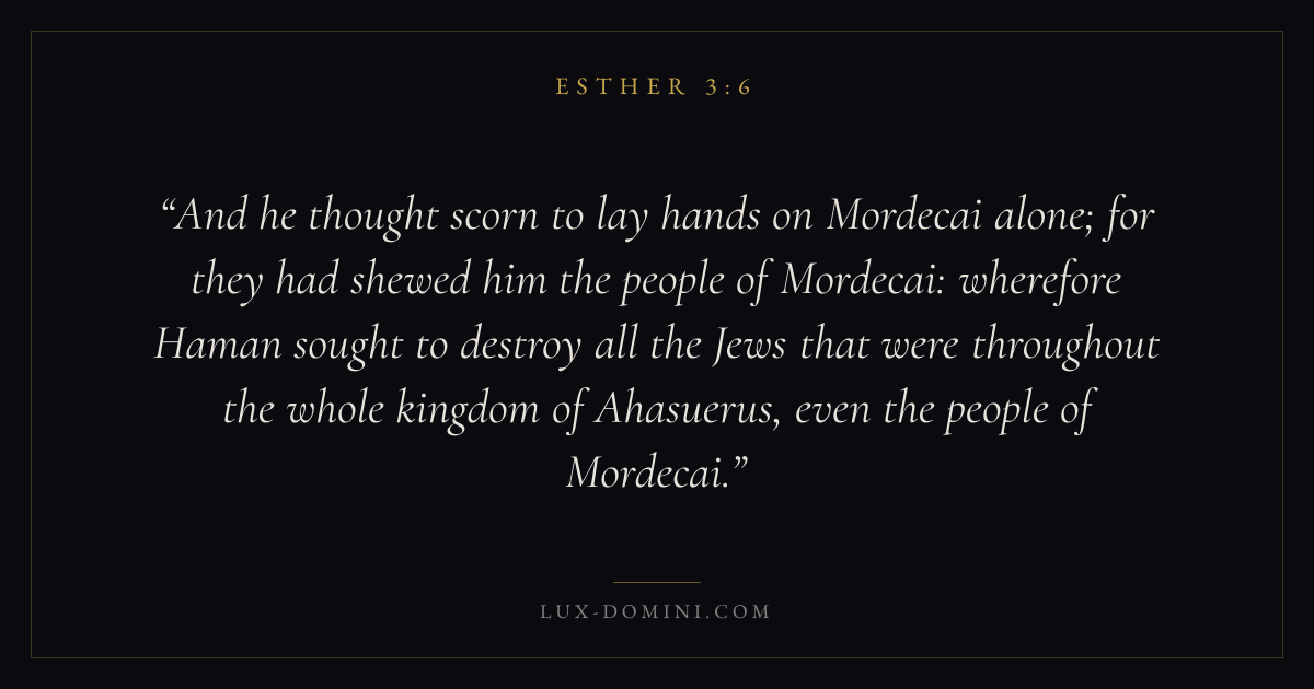 And he thought scorn to lay hands on Mordecai alone; for they had shewed him the people of Mordecai: wherefore Haman sought to destroy all the Jews that were throughout the whole kingdom of Ahasuerus, even the people of Mordecai.