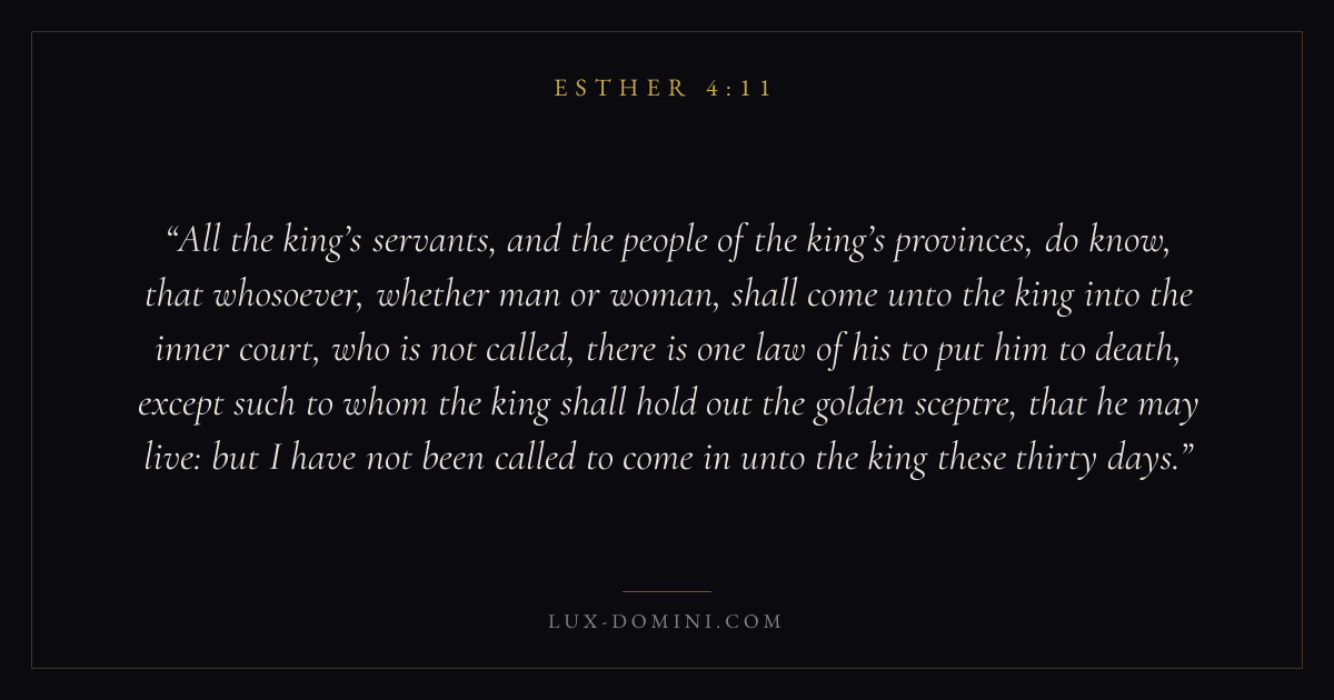 All the king’s servants, and the people of the king’s provinces, do know, that whosoever, whether man or woman, shall come unto the king into the inner court, who is not called, there is one law of his to put him to death, except such to whom the king shall hold out the golden sceptre, that he may live: but I have not been called to come in unto the king these thirty days.