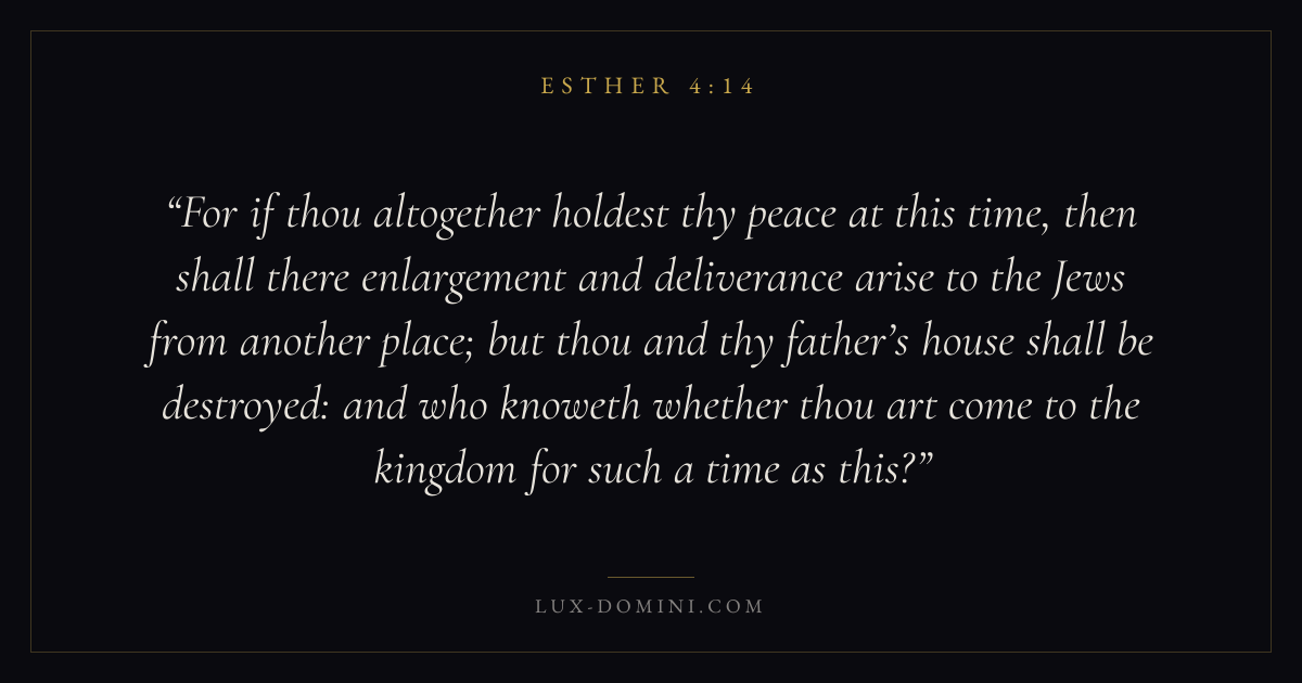 For if thou altogether holdest thy peace at this time, then shall there enlargement and deliverance arise to the Jews from another place; but thou and thy father’s house shall be destroyed: and who knoweth whether thou art come to the kingdom for such a time as this?