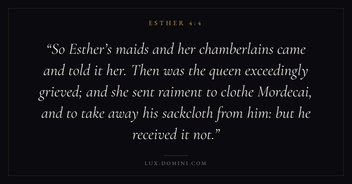 So Esther’s maids and her chamberlains came and told it her. Then was the queen exceedingly grieved; and she sent raiment to clothe Mordecai, and to take away his sackcloth from him: but he received it not.