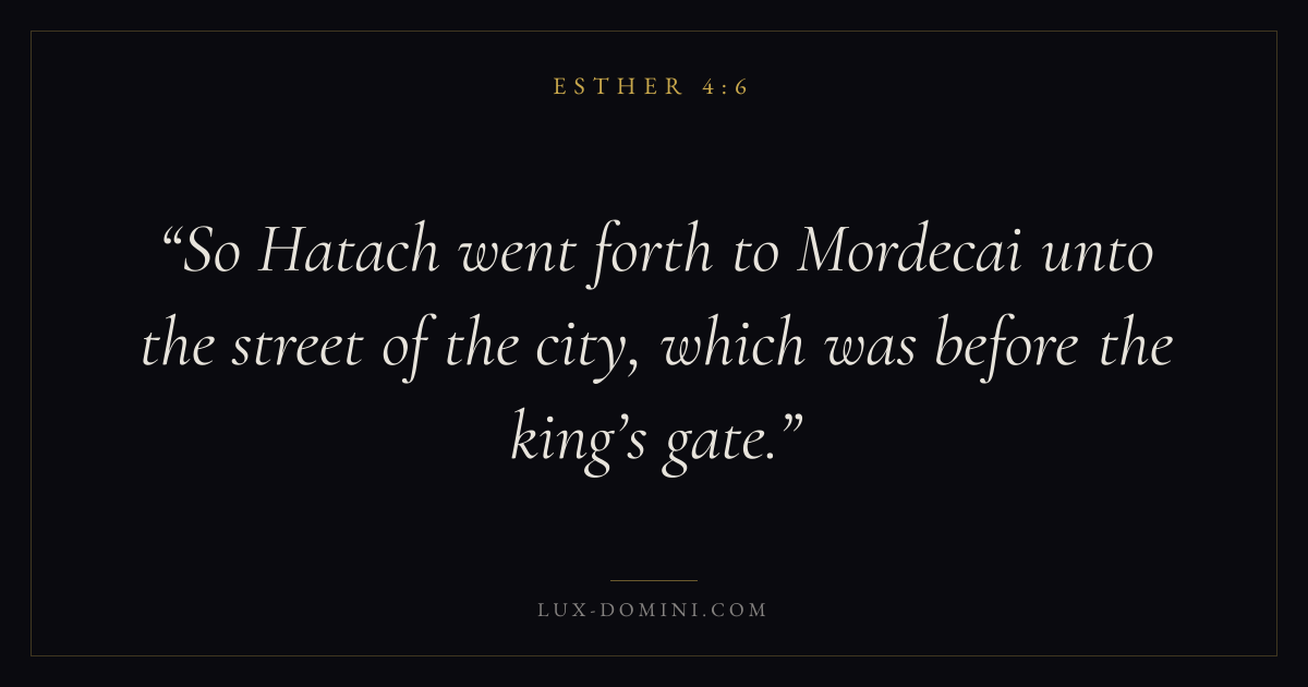 So Hatach went forth to Mordecai unto the street of the city, which was before the king’s gate.