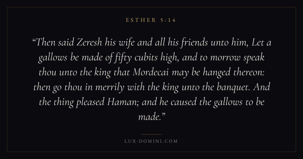 Then said Zeresh his wife and all his friends unto him, Let a gallows be made of fifty cubits high, and to morrow speak thou unto the king that Mordecai may be hanged thereon: then go thou in merrily with the king unto the banquet. And the thing pleased Haman; and he caused the gallows to be made.