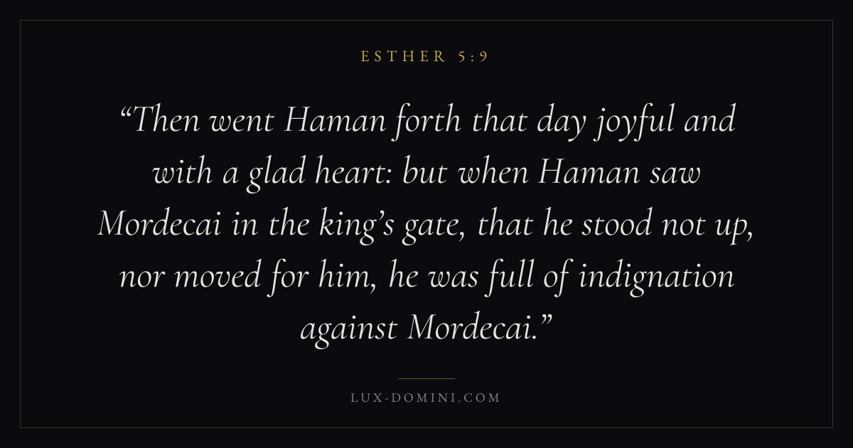 Then went Haman forth that day joyful and with a glad heart: but when Haman saw Mordecai in the king’s gate, that he stood not up, nor moved for him, he was full of indignation against Mordecai.