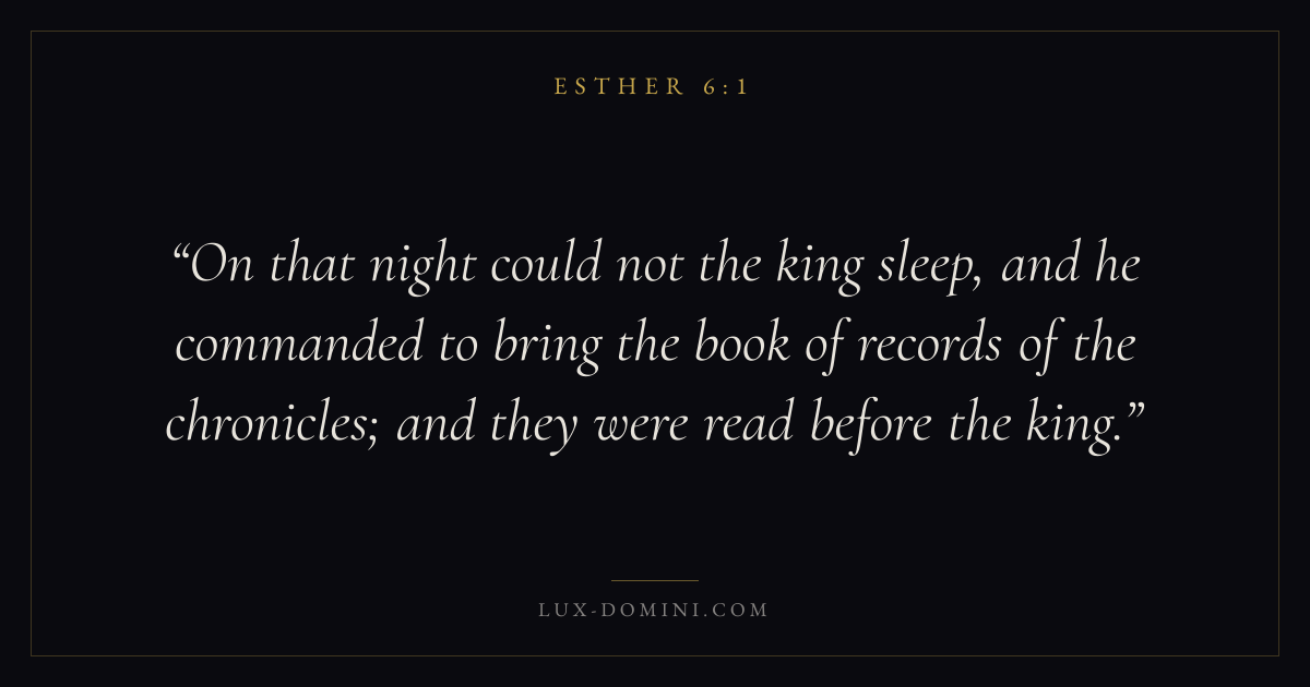 On that night could not the king sleep, and he commanded to bring the book of records of the chronicles; and they were read before the king.