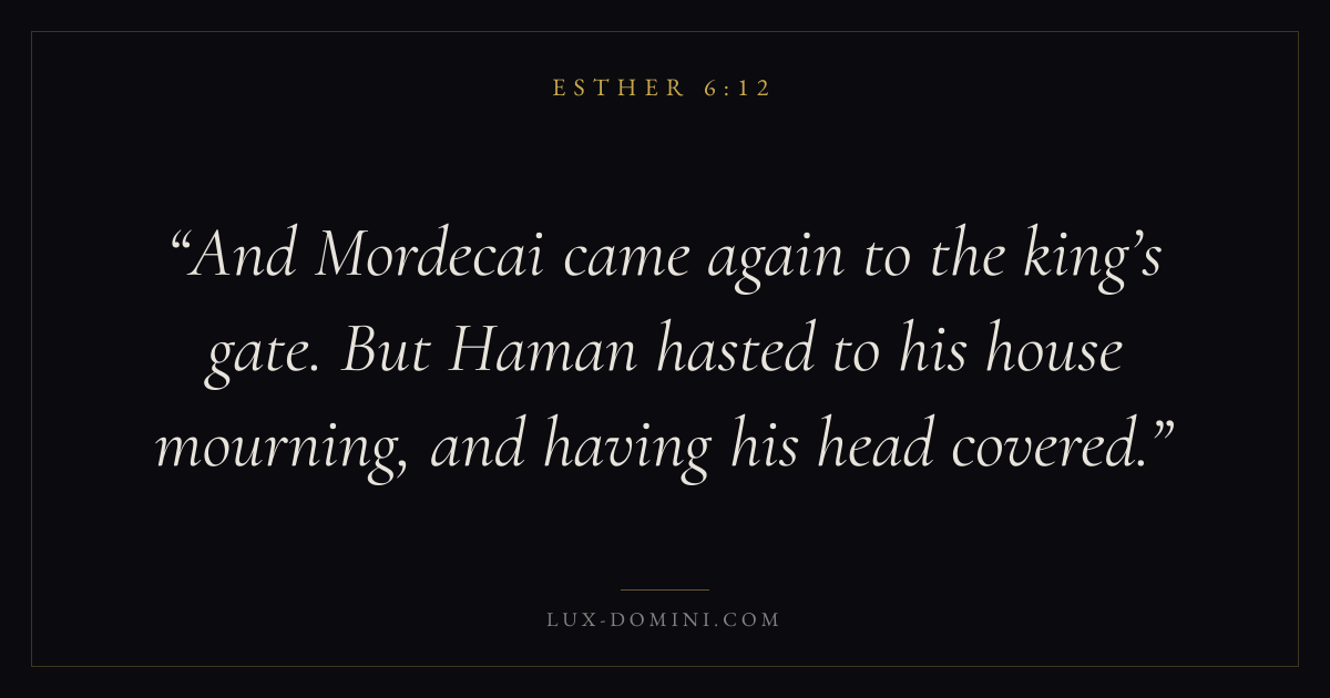 And Mordecai came again to the king’s gate. But Haman hasted to his house mourning, and having his head covered.