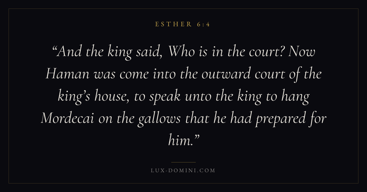 And the king said, Who is in the court? Now Haman was come into the outward court of the king’s house, to speak unto the king to hang Mordecai on the gallows that he had prepared for him.