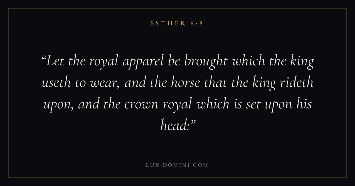 Let the royal apparel be brought which the king useth to wear, and the horse that the king rideth upon, and the crown royal which is set upon his head: