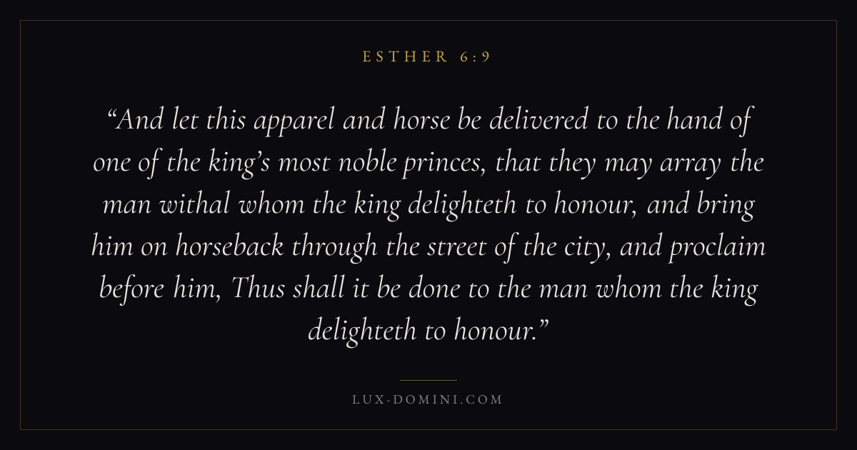 And let this apparel and horse be delivered to the hand of one of the king’s most noble princes, that they may array the man withal whom the king delighteth to honour, and bring him on horseback through the street of the city, and proclaim before him, Thus shall it be done to the man whom the king delighteth to honour.
