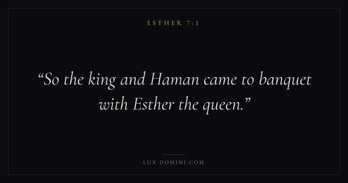 Books / Esther / Chapter 7 / Verse 1 ← Esther 6:14 Esther 7:1 Esther 7:2 → So the king and Haman came to banquet with Esther the queen. Download verse card Share on Twitter Share on Facebook Pin it ✦ Key themes LovePrayerSalvationProvidence Read with Esther 7:2Esther 7:3John 3:161 Corinthians 13:4 Related topics Bible verses about loveBible verses about prayerBible verses about salvationBible verses about trusting God ✦ Esther Chapter 7 verses V. 1 V. 2 V. 3 V. 4 V. 5 V. 6 V. 7 V. 8 V. 9 V. 10