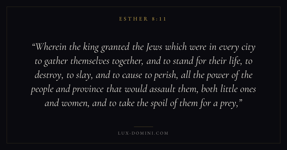 Wherein the king granted the Jews which were in every city to gather themselves together, and to stand for their life, to destroy, to slay, and to cause to perish, all the power of the people and province that would assault them, both little ones and women, and to take the spoil of them for a prey,
