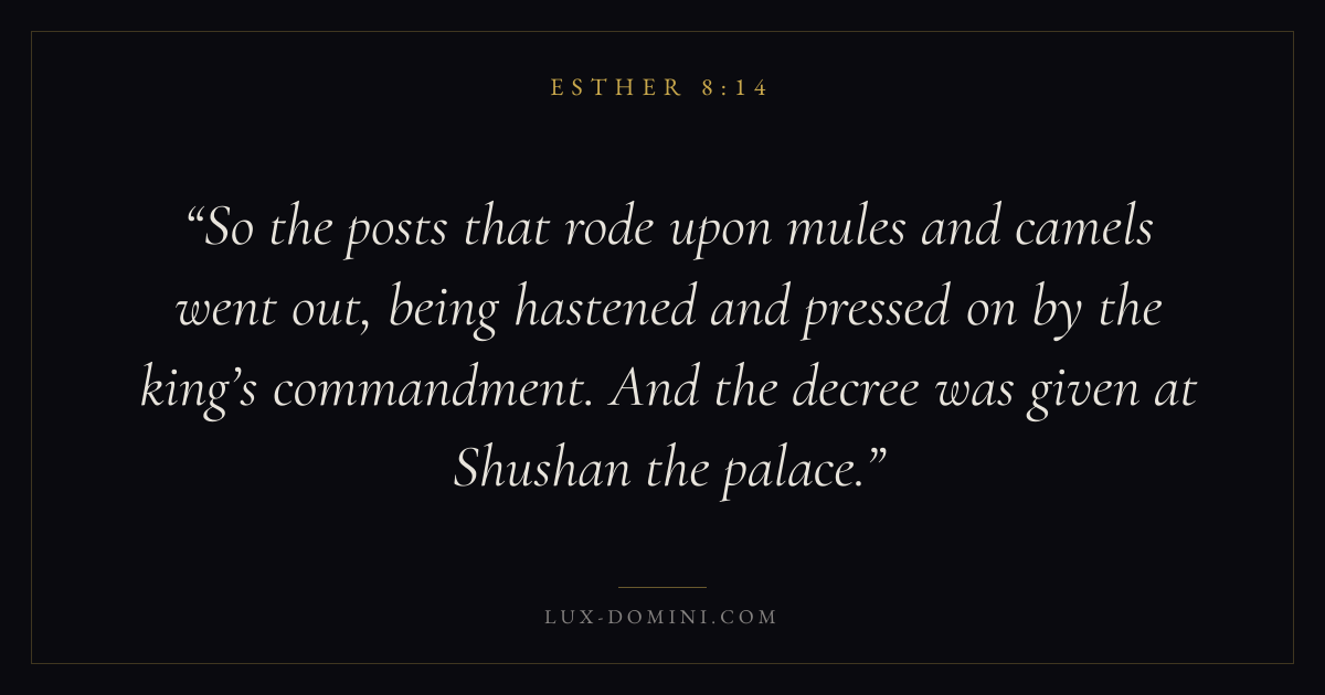 So the posts that rode upon mules and camels went out, being hastened and pressed on by the king’s commandment. And the decree was given at Shushan the palace.