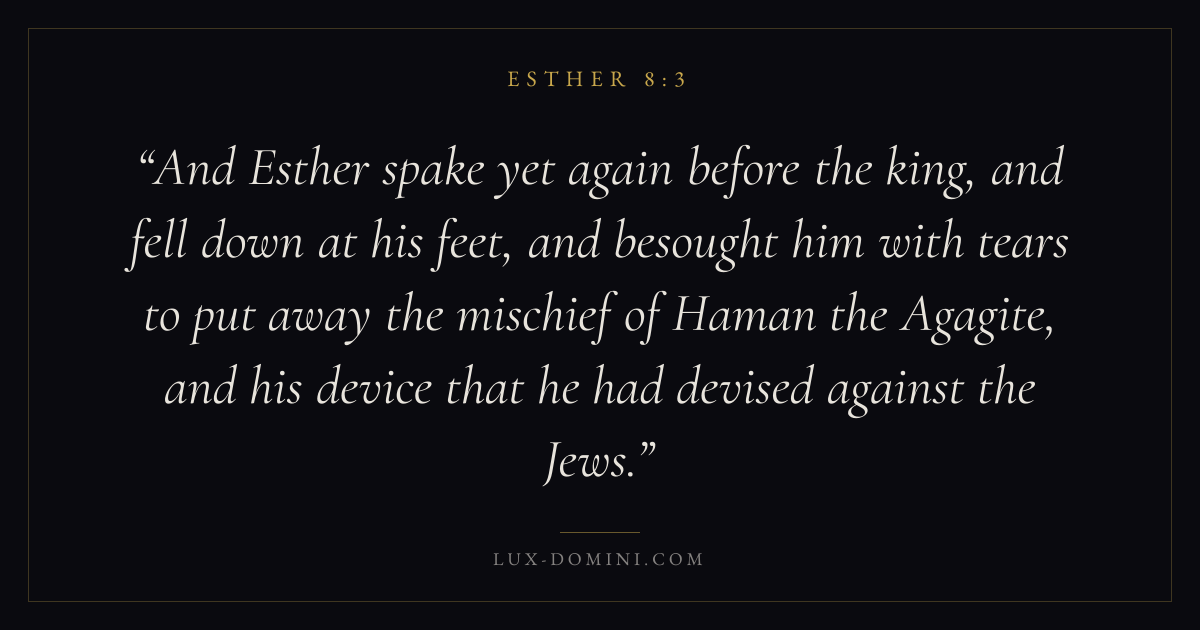 And Esther spake yet again before the king, and fell down at his feet, and besought him with tears to put away the mischief of Haman the Agagite, and his device that he had devised against the Jews.