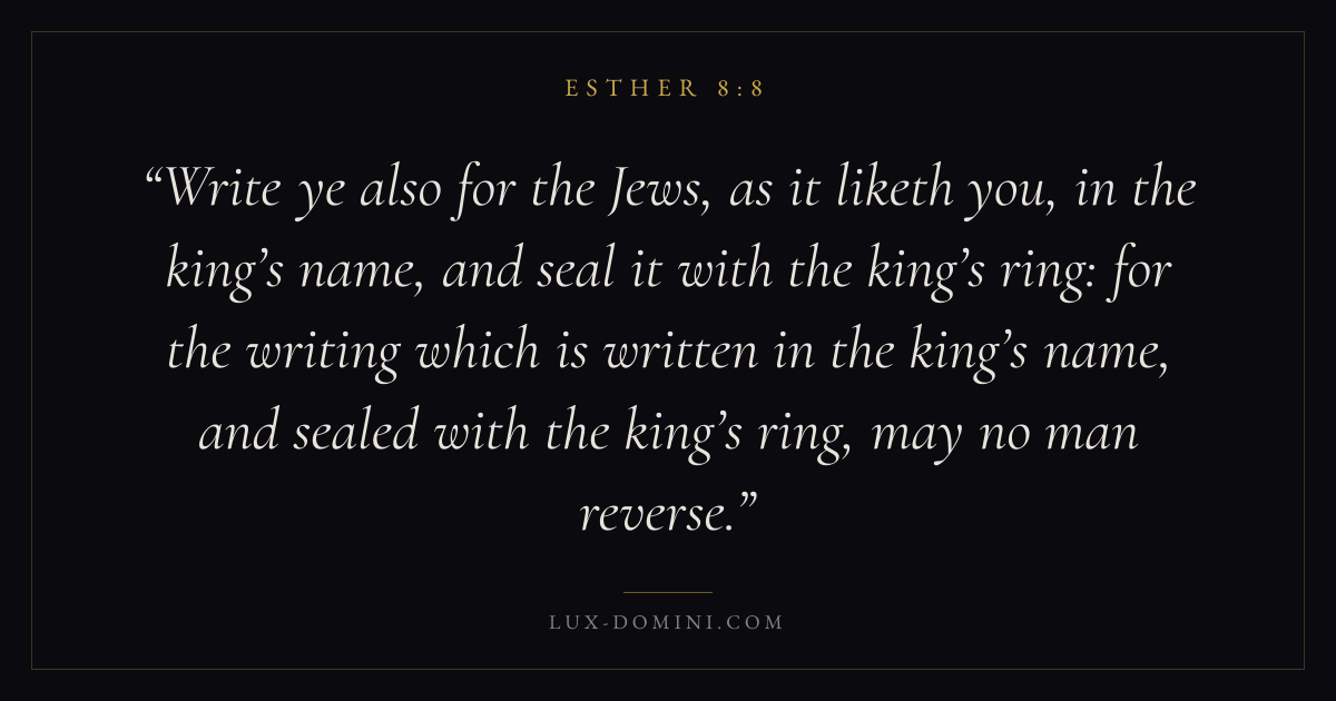 Write ye also for the Jews, as it liketh you, in the king’s name, and seal it with the king’s ring: for the writing which is written in the king’s name, and sealed with the king’s ring, may no man reverse.