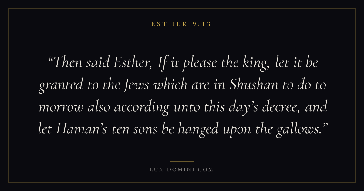 Then said Esther, If it please the king, let it be granted to the Jews which are in Shushan to do to morrow also according unto this day’s decree, and let Haman’s ten sons be hanged upon the gallows.
