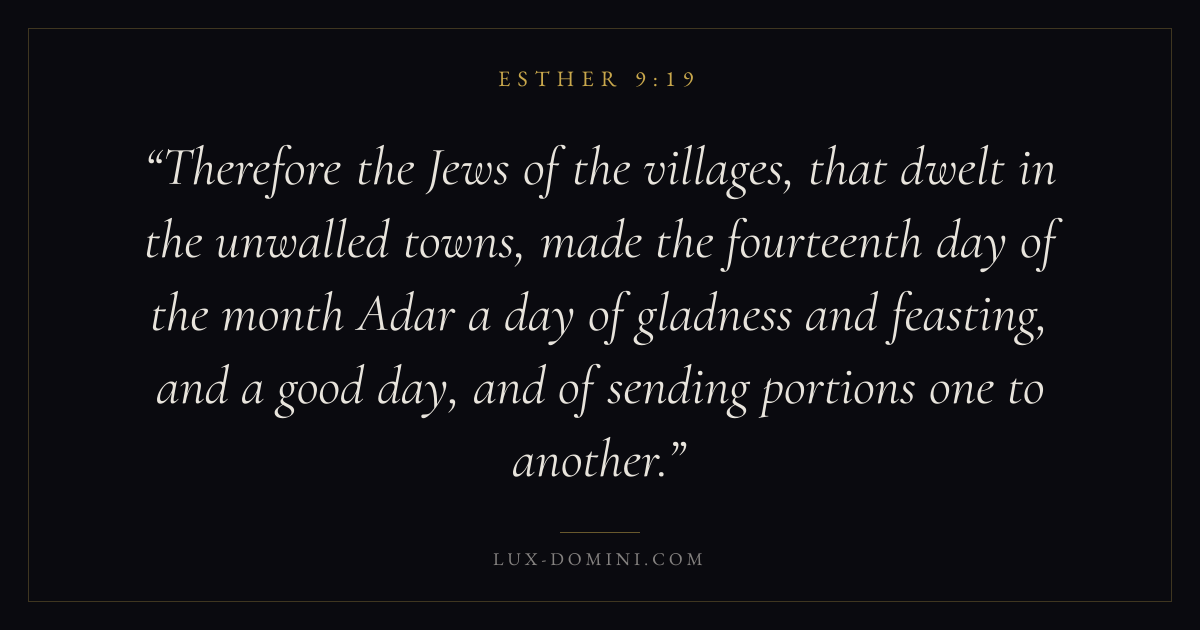 Therefore the Jews of the villages, that dwelt in the unwalled towns, made the fourteenth day of the month Adar a day of gladness and feasting, and a good day, and of sending portions one to another.