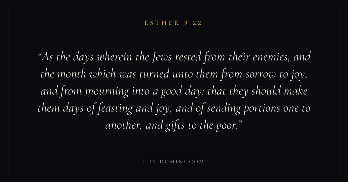 As the days wherein the Jews rested from their enemies, and the month which was turned unto them from sorrow to joy, and from mourning into a good day: that they should make them days of feasting and joy, and of sending portions one to another, and gifts to the poor.