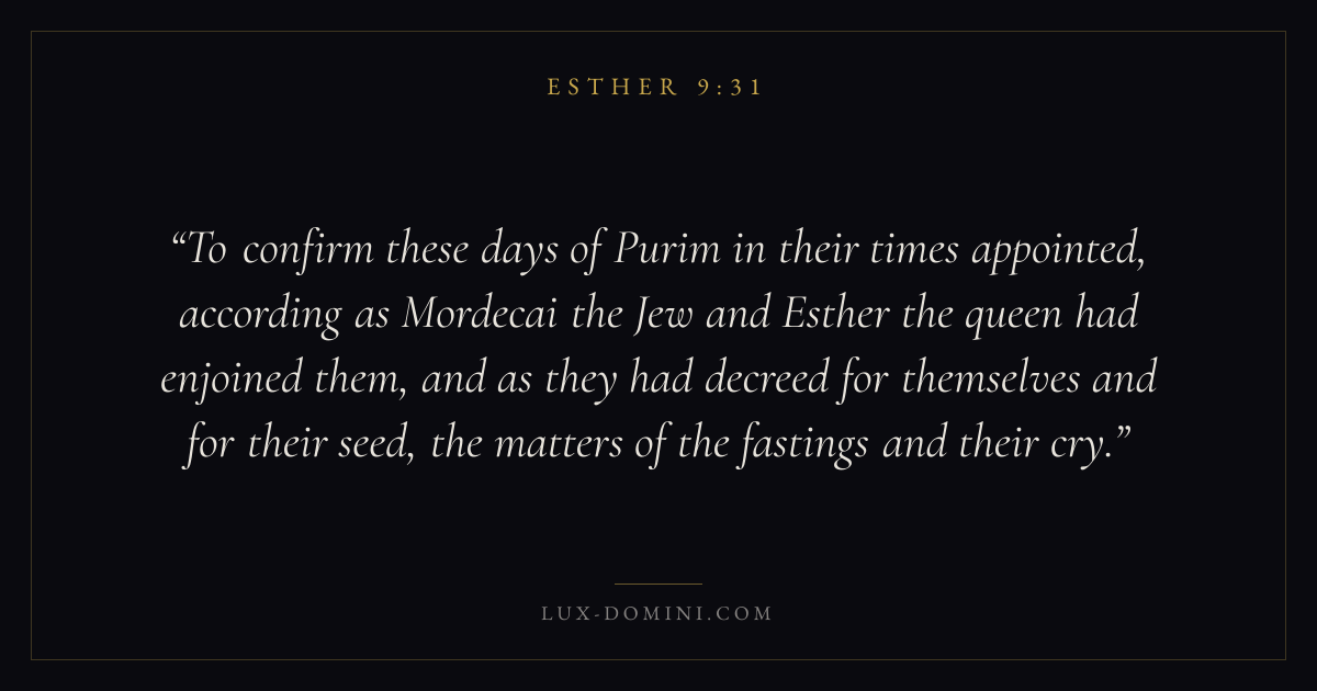 To confirm these days of Purim in their times appointed, according as Mordecai the Jew and Esther the queen had enjoined them, and as they had decreed for themselves and for their seed, the matters of the fastings and their cry.