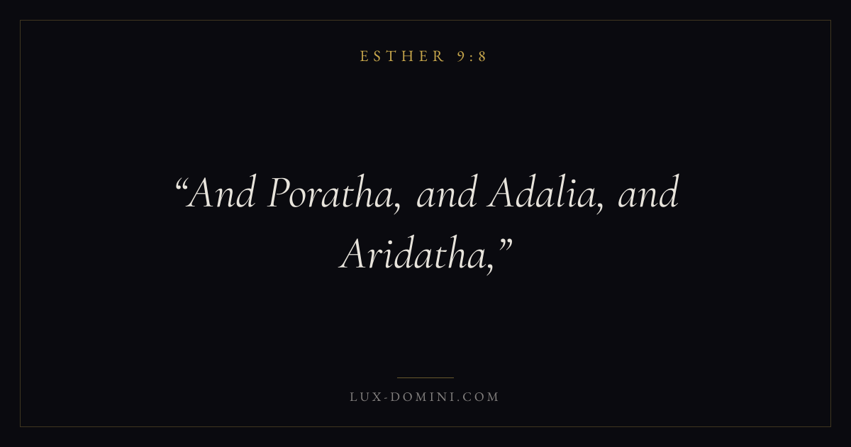 Books / Esther / Chapter 9 / Verse 8 ← Esther 9:7 Esther 9:8 Esther 9:9 → And Poratha, and Adalia, and Aridatha, Download verse card Share on Twitter Share on Facebook Pin it ✦ Key themes SalvationProvidenceCourageHiddenness Read with Esther 9:5Esther 9:6John 3:16Ephesians 2:8 Related topics Bible verses about salvationBible verses about trusting GodBible verses about strength ✦ Esther Chapter 9 verses V. 1 V. 2 V. 3 V. 4 V. 5 V. 6 V. 7 V. 8 V. 9 V. 10 V. 11 V. 12 V. 13 V. 14 V. 15 V. 16 V. 17 V. 18 V. 19 V. 20 V. 21 V. 22 V. 23 V. 24 V. 25 V. 26 V. 27 V. 28 V. 29 V. 30 V. 31 V. 32