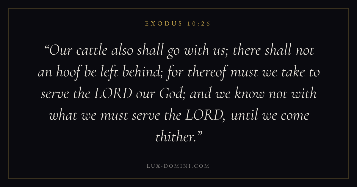 Our cattle also shall go with us; there shall not an hoof be left behind; for thereof must we take to serve the LORD our God; and we know not with what we must serve the LORD, until we come thither.