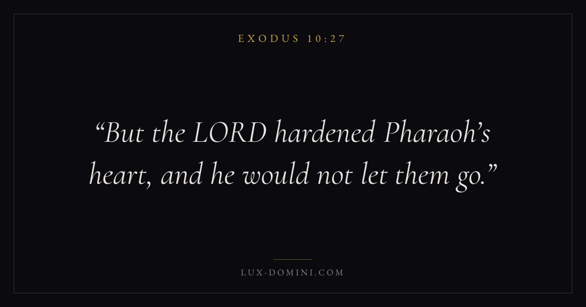 Books / Exodus / Chapter 10 / Verse 27 ← Exodus 10:26 Exodus 10:27 Exodus 10:28 → But the LORD hardened Pharaoh’s heart, and he would not let them go. Download verse card Share on Twitter Share on Facebook Pin it ✦ Key themes SalvationRedemptionPassoverCovenant Read with Exodus 10:28Exodus 10:29John 3:16Ephesians 2:8 Related topics Bible verses about salvation ✦ Exodus Chapter 10 verses V. 1 V. 2 V. 3 V. 4 V. 5 V. 6 V. 7 V. 8 V. 9 V. 10 V. 11 V. 12 V. 13 V. 14 V. 15 V. 16 V. 17 V. 18 V. 19 V. 20 V. 21 V. 22 V. 23 V. 24 V. 25 V. 26 V. 27 V. 28 V. 29