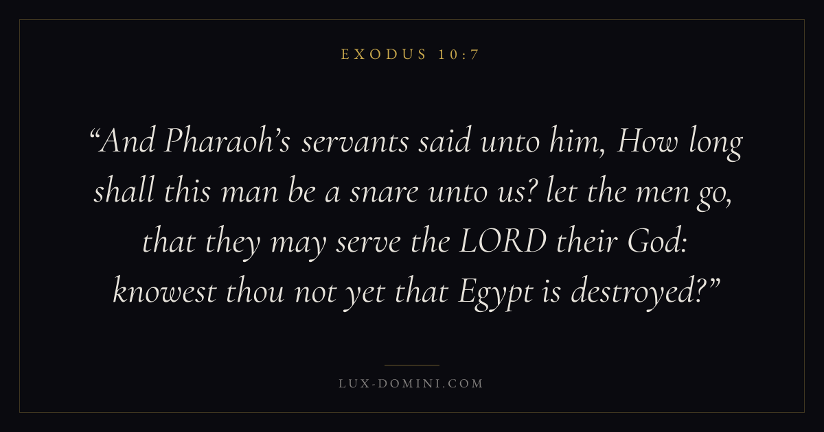 And Pharaoh’s servants said unto him, How long shall this man be a snare unto us? let the men go, that they may serve the LORD their God: knowest thou not yet that Egypt is destroyed?