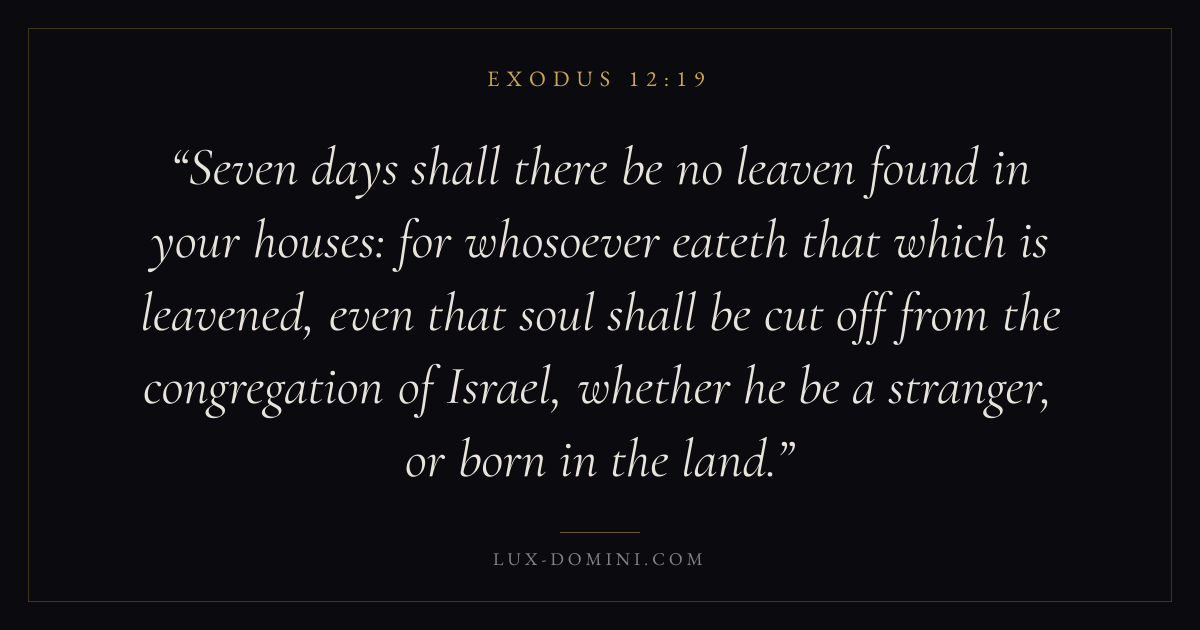 Seven days shall there be no leaven found in your houses: for whosoever eateth that which is leavened, even that soul shall be cut off from the congregation of Israel, whether he be a stranger, or born in the land.