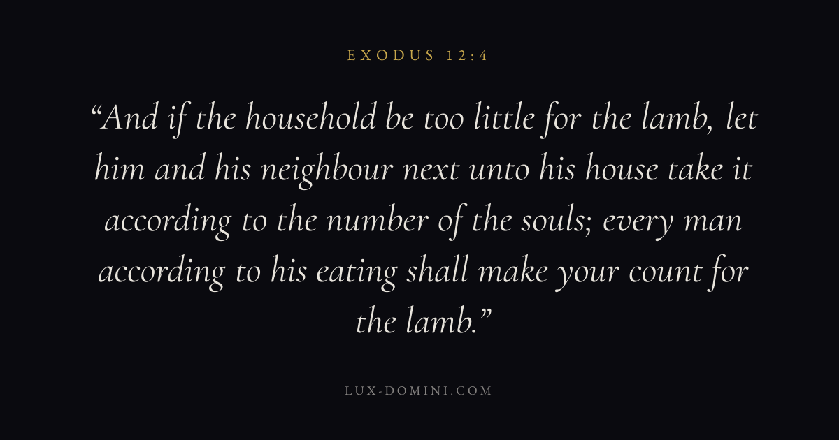 And if the household be too little for the lamb, let him and his neighbour next unto his house take it according to the number of the souls; every man according to his eating shall make your count for the lamb.