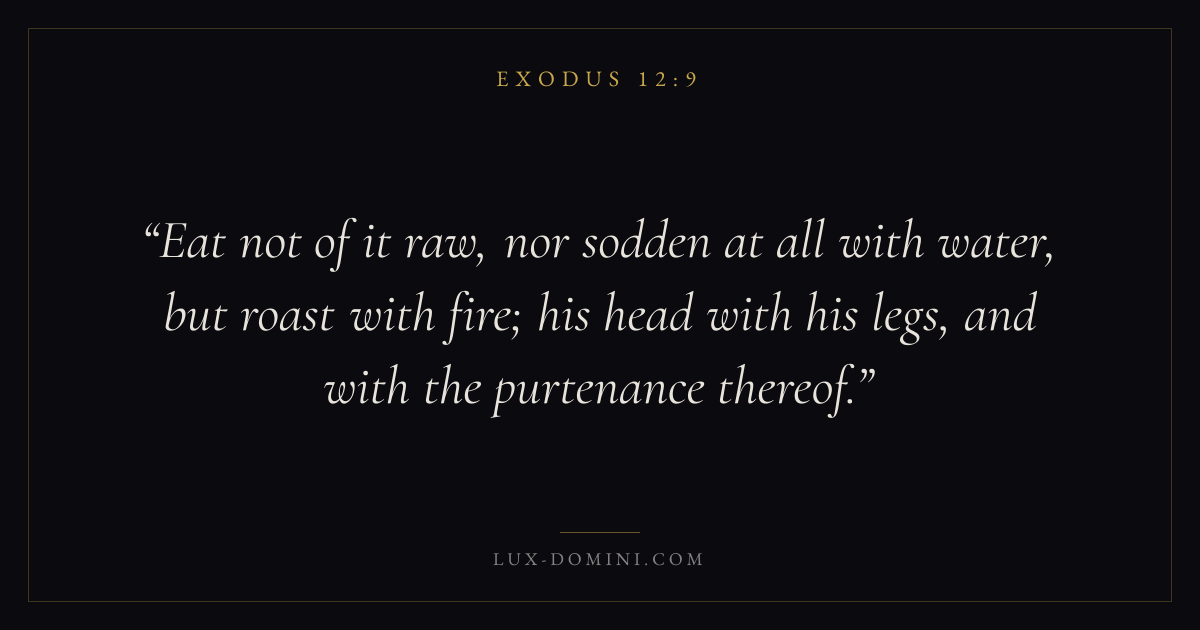 Eat not of it raw, nor sodden at all with water, but roast with fire; his head with his legs, and with the purtenance thereof.