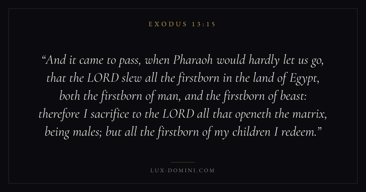 And it came to pass, when Pharaoh would hardly let us go, that the LORD slew all the firstborn in the land of Egypt, both the firstborn of man, and the firstborn of beast: therefore I sacrifice to the LORD all that openeth the matrix, being males; but all the firstborn of my children I redeem.