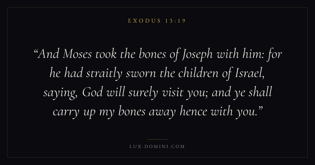 And Moses took the bones of Joseph with him: for he had straitly sworn the children of Israel, saying, God will surely visit you; and ye shall carry up my bones away hence with you.