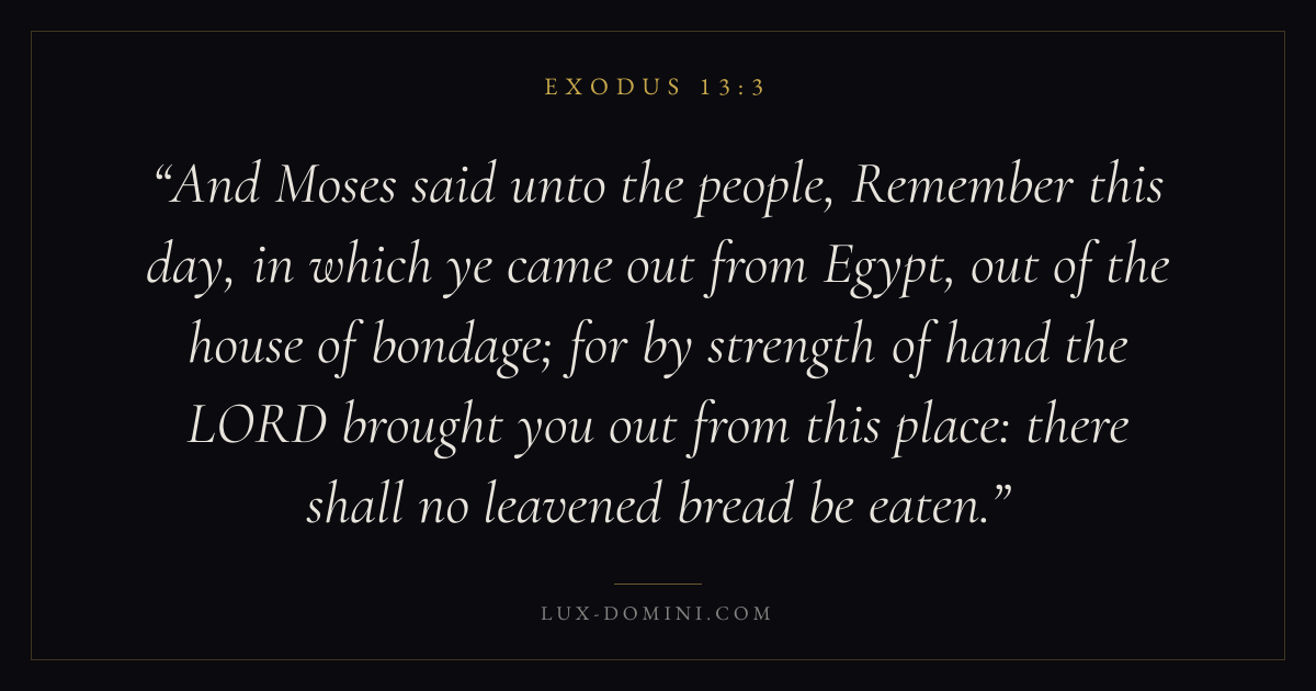 And Moses said unto the people, Remember this day, in which ye came out from Egypt, out of the house of bondage; for by strength of hand the LORD brought you out from this place: there shall no leavened bread be eaten.