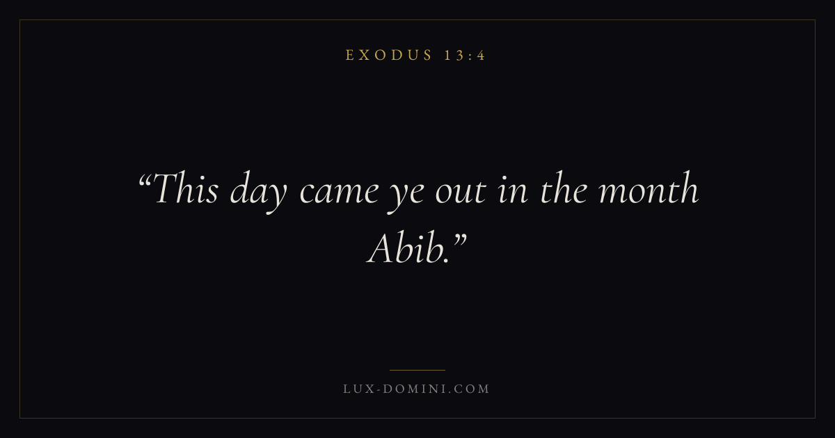 Books / Exodus / Chapter 13 / Verse 4 ← Exodus 13:3 Exodus 13:4 Exodus 13:5 → This day came ye out in the month Abib. Download verse card Share on Twitter Share on Facebook Pin it ✦ Key themes SalvationRedemptionPassoverCovenant Read with Exodus 13:3John 3:16Ephesians 2:8 Related topics Bible verses about salvation ✦ Exodus Chapter 13 verses V. 1 V. 2 V. 3 V. 4 V. 5 V. 6 V. 7 V. 8 V. 9 V. 10 V. 11 V. 12 V. 13 V. 14 V. 15 V. 16 V. 17 V. 18 V. 19 V. 20 V. 21 V. 22