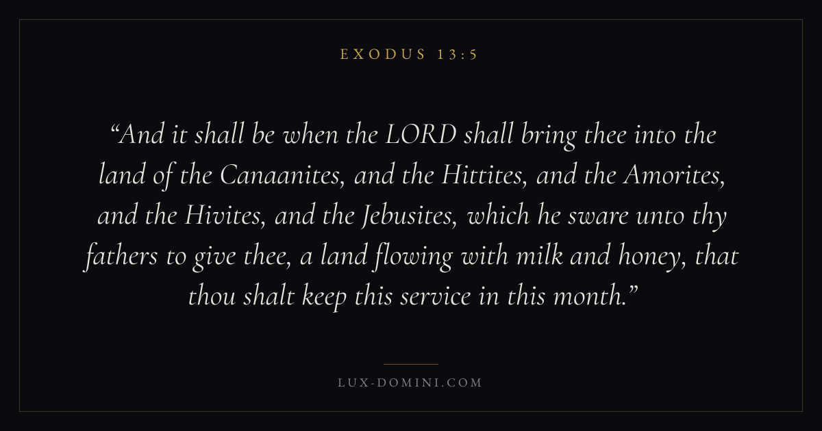 And it shall be when the LORD shall bring thee into the land of the Canaanites, and the Hittites, and the Amorites, and the Hivites, and the Jebusites, which he sware unto thy fathers to give thee, a land flowing with milk and honey, that thou shalt keep this service in this month.