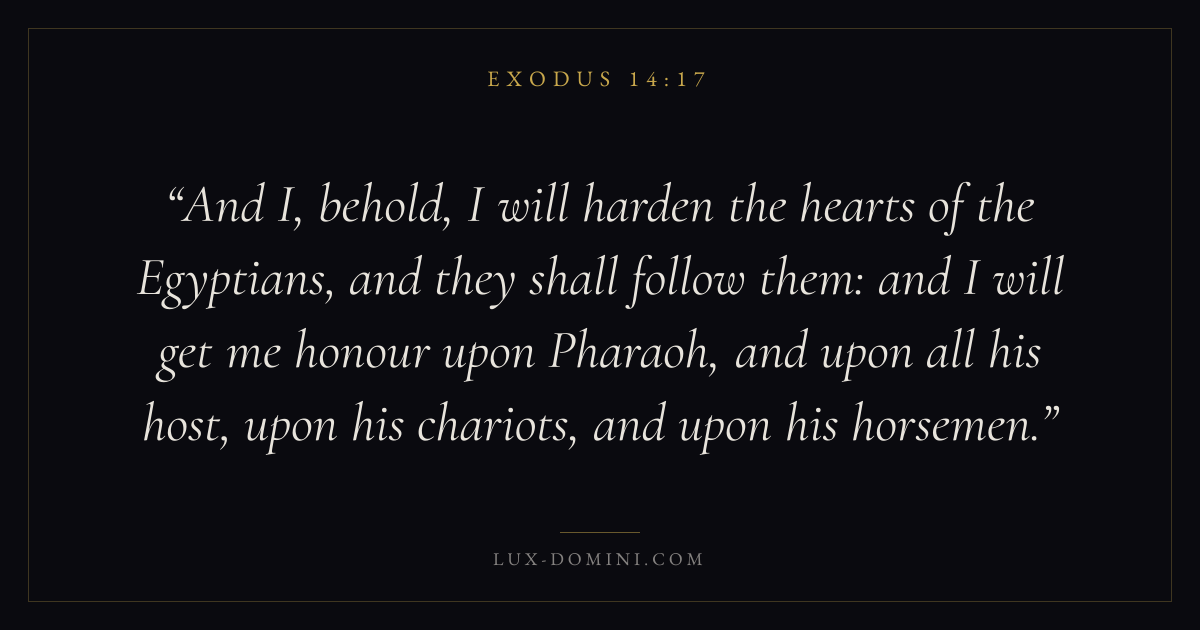 And I, behold, I will harden the hearts of the Egyptians, and they shall follow them: and I will get me honour upon Pharaoh, and upon all his host, upon his chariots, and upon his horsemen.